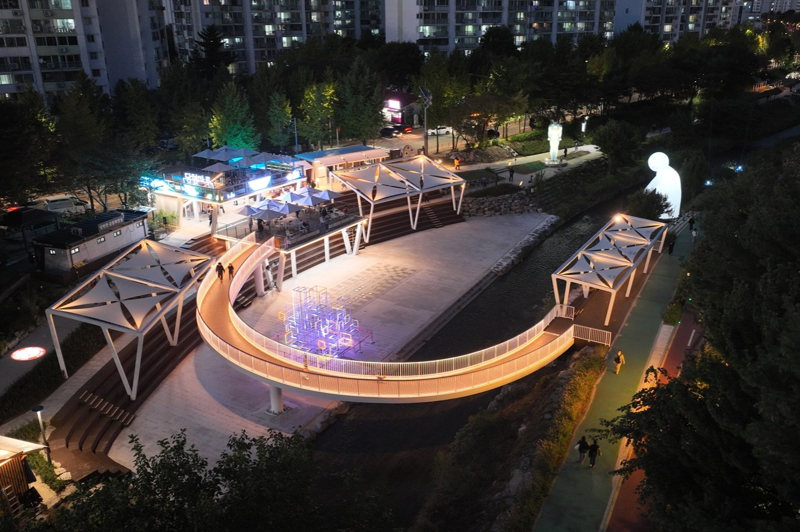 수변문화쉼터 ‘당현천 당현마루’의 디자인 콘셉트는 ‘자연과 커뮤니티의 조화’다. 우선 하천 때문에 왕래가 적었던 중계동과 상계동을 달빛 브릿지로 이어 지역주민들의 소통·문화 공간으로 새단장했다.