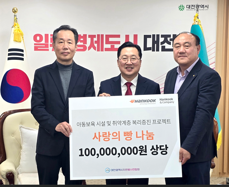 [파이낸셜뉴스] 한국타이어앤테크놀로지(한국타이어)는 지난 29일 대전시청에서 '사랑의 빵 나눔 사업' 후원금 1억원을 전달했다고 30일 밝혔다.