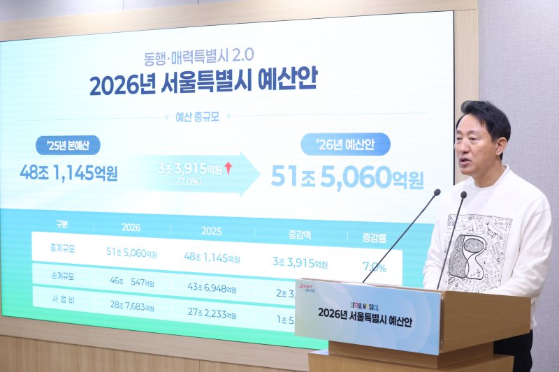 오세훈 서울시장은 30일 서울시청에서 예산안 기자회견을 열고 "건전재정 기조로 지난 4년간 채무 약 6000억원을 줄였지만, 올해는 정부의 민생회복 소비쿠폰 발행으로 불가피하게 채무 규모가 증가할 것으로 예상된다"며 "이런 상황에서도 미래세대가 갚아야 할 빚은 절대 늘리지 않겠다는 각오로 예산 편성에 임했다"고 설명했다.
