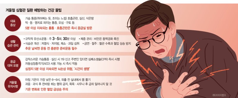 심혈관 질환 예방의 첫걸음은 생활습관 교정이다. 이 교수는 "1주일에 3~5일, 30분 이상 걷기나 자전거 타기 같은 유산소 운동을 하면 좋다"며 "단, 추운 날씨에는 반드시 실내에서 준비운동을 하고 외출해야 한다"고 조언했다.