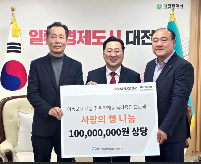 한국타이어앤테크놀로지(한국타이어)는 지난 29일 대전시청에서 '사랑의 빵 나눔 사업' 후원금 1억원을 전달했다고 30일 밝혔다.