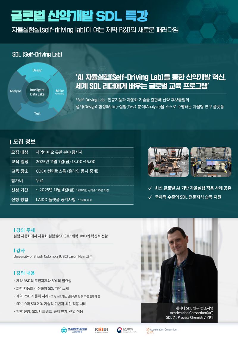 행사는 보건복지부와 한국보건산업진흥원의 '인공지능(AI) 활용 신약개발 교육 및 홍보(2차 추경)' 사업의 일환으로 마련됐다. SDL 분야 석학인 제이슨 하인 캐나다 브리티시컬럼비아대 교수를 초청해 진행된다. 하인 교수는 화학 반응 자동화 및 SDL 기술의 선도적 연구자로 글로벌 제약 R&D 분야에서 자율화 실험의 혁신을 이끌고 있다.