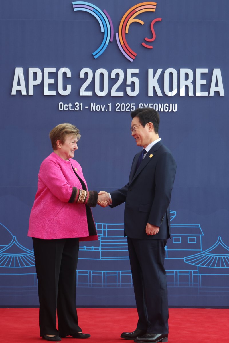 이재명 대통령이 31일 경주화백컨벤션센터(HICO)에서 열린 2025 아시아태평양경제협력체(APEC) 정상회의에 참석한 크리스탈리나 게오르기에바 IMF 총재를 맞이하고 있다.연합뉴스