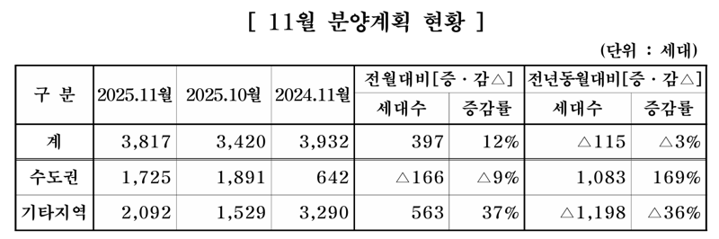 31일 대한주택건설협회는 회원사를 대상으로 11월 주택분양계획을 집계한 결과, 14개사가 14개 사업장에서 총 3817가구를 공급하는 것으로 파악됐다고 밝혔다. 전월(3420가구)보다 397가구(12%) 늘었으나, 전년 동월(3932가구)에 비해서는 115가구(3%) 줄었다.