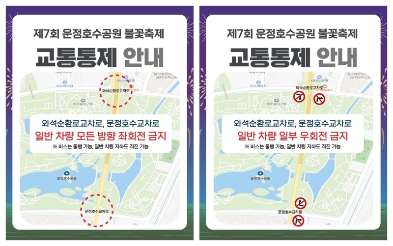 무엇보다 올해 파주시는 시민 안전을 최우선으로 하여 곳곳에 안전요원을 배치하고, 행사 당일 오후 5시부터 10시까지는 축제장 주변 교통을 일부 통제할 예정이다. 특히 와석순환교차로와 운정호수교차로 사거리에서는 일반 차량의 좌회전이 전면 금지되며, 직진만 허용된다. 또한 일부 구간은 우회전도 제한될 예정이다.
