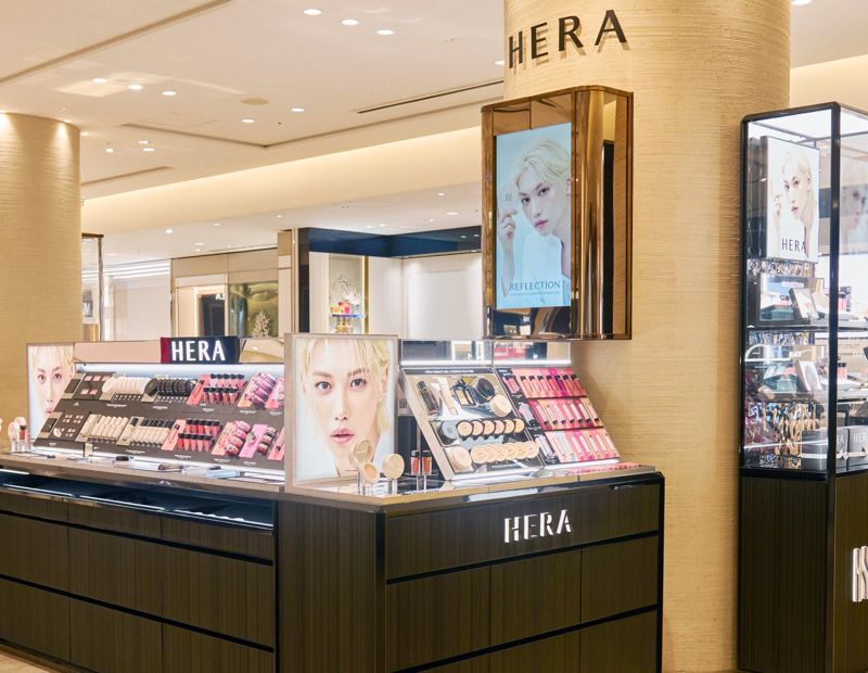 대표적인 사례는 아모레퍼시픽의 컨템포러리 뷰티 브랜드 '헤라'다. 헤라는 지난 8월, 보이그룹 '스트레이 키즈'의 멤버 필릭스를 글로벌 앰버서더로 발탁했다. 현재 전세계 헤라 매장에서는 필릭스가 하이라이터, 글로시한 제형의 립 제품 등을 활용한 메이크업을 한 대형 이미지를 전면에 내세우고 있다.