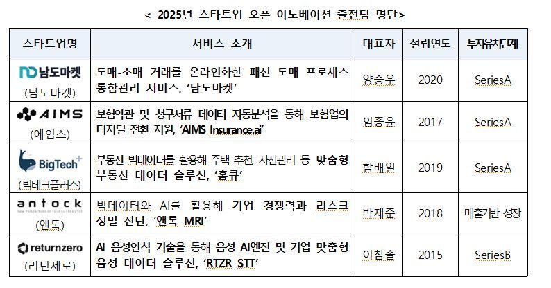 지난 10일까지 공모를 통해 지원한 59개 스타트업 중 사전심사를 통해 5곳을 추렸다. △남도마켓 △에임스 △빅테크플러스 △앤톡 △리턴제 등이다.