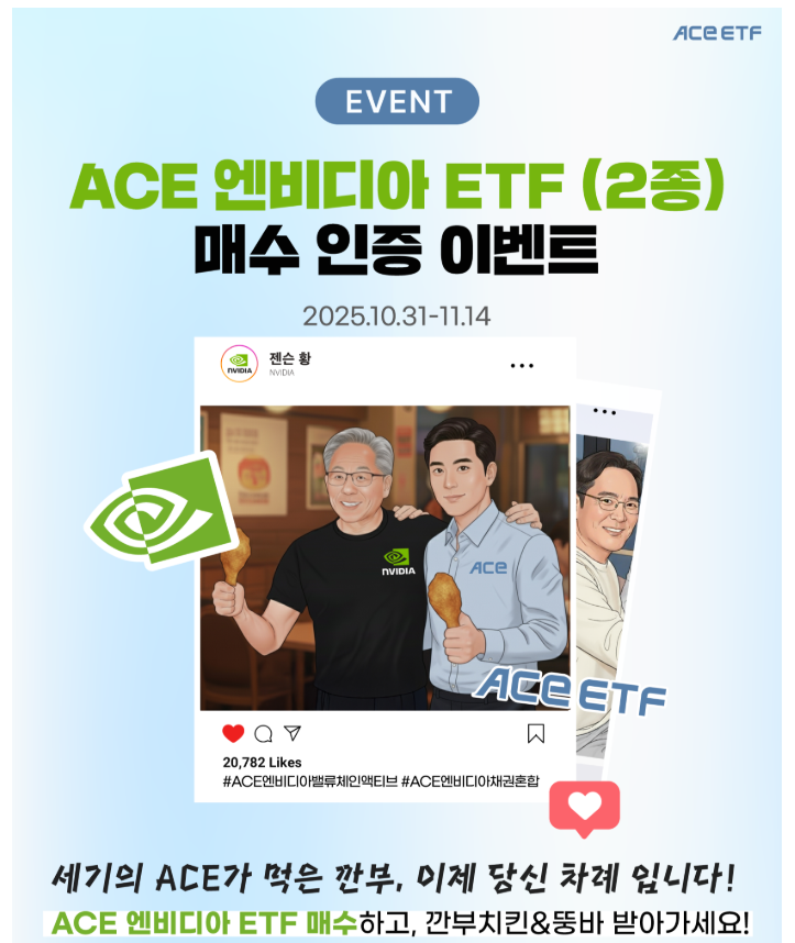 행사 기간 동안 ‘ACE 엔비디아밸류체인액티브 ETF’ 또는 ‘ACE 엔비디아채권혼합 ETF’ 중 한 종목을 10주 이상 신규 매수한 뒤 인증하면 응모할 수 있다. 추첨 결과는 다음 달 26일 ACE ETF 홈페이지에서 확인 가능하며, 당첨자에게는 깐부치킨 메뉴 등이 제공된다.