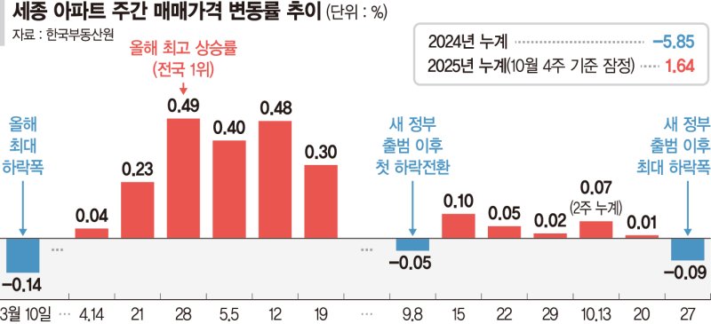 올봄 전국에서 가장 가파르게 뛰었던 세종시 아파트값이 새 정부 출범 이후 급격히 식고 있다. 한때 '행정수도 프리미엄' 기대감에 들떴던 시장은 거래 위축과 공급 부담이 겹치며 반년 만에 하락세로 돌아섰다. 단기 과열로 형성됐던 '버블'이 빠르게 꺼지고 있다는 평가다.