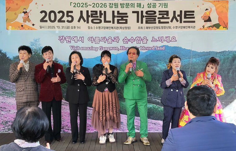 재부산강원도청장년회(회장 안정태)는 지난달 31일 부산 광안동 수영구장애인복지관 옥상정원에서 지역 저소득 어르신, 장애인들을 초청해 '2025~2026 강원 방문의 해' 성공을 기원하는 '사랑나눔 가을콘서트'를 개최했다고 2일 밝혔다.