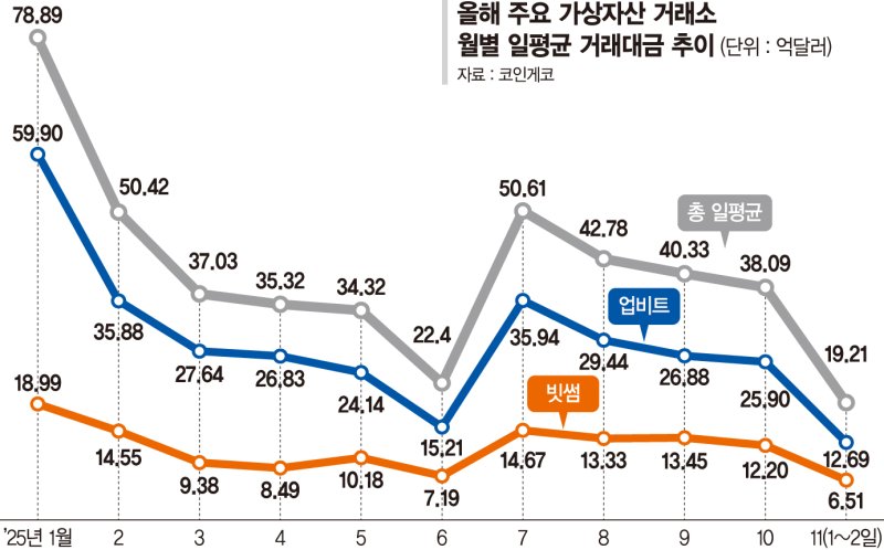 3일 가상자산 시황플랫폼 코인게코에 따르면 지난 1~2일 국내 가상자산 거래소 업비트와 빗썸의 총 거래대금은 38억달러, 일평균은 19억달러 수준이다. 연중 최저치의 일평균 거래대금이다.