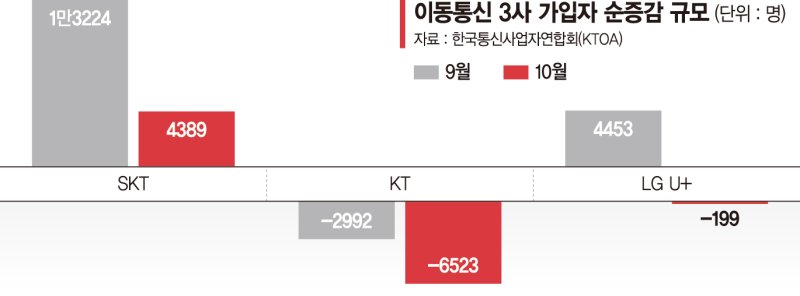 SKT는 이통3사 전체 번호이동 수가 줄었음에도 10월에 소폭 순증세를 보였다. 지난달 11만9883명이 유입되고 11만5494명 유출돼 지난 9월(1만3224명)에 이어 연속 순증을 기록했다.