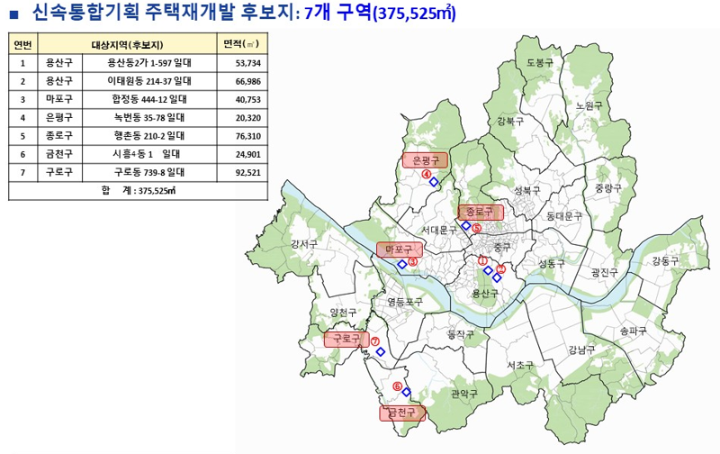 신규 지정 대상은 △용산구 2곳(용산동2가 1-597 일대·이태원동 214-37 일대) △마포구 1곳(합정동 444-12 일대) △은평구 1곳(녹번동 35-78 일대) △금천구 1곳(시흥4동1 일대) △구로구 1곳(구로동739-8일대) △종로구 1곳(행촌동 210-2 일대)이다. 아울러 기존 신속통합기획 주택재개발 선정지 1곳(마포구 공덕동 11-24)은 사업구역 결정 경계에 맞춰 토지거래허가구역 경계를 조정했다.