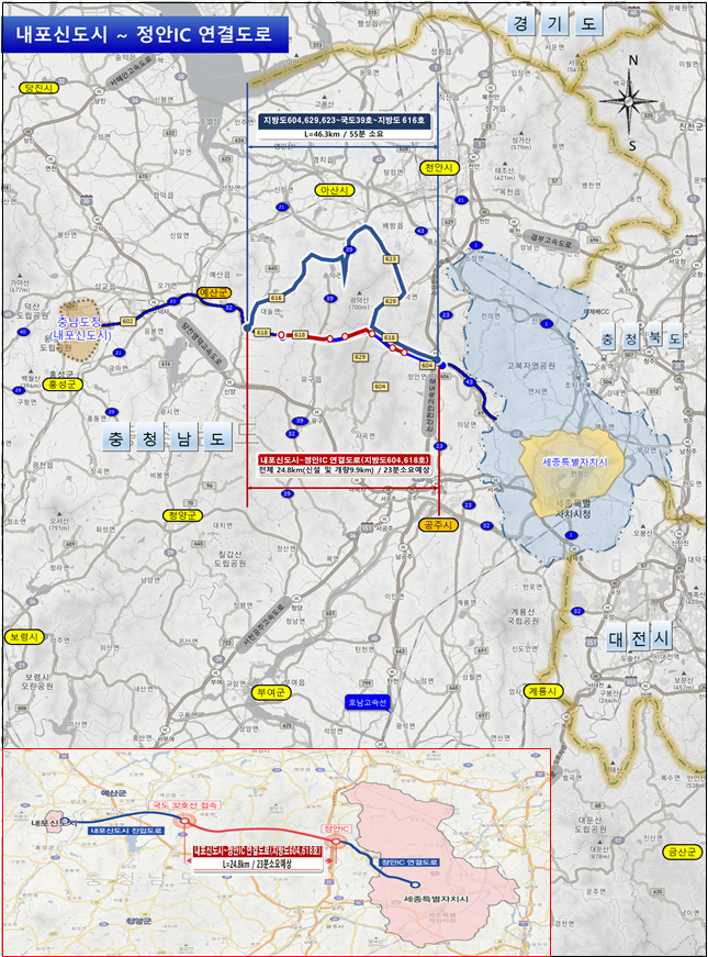내포신도시~정안IC 연결도로 건설 사업은 2020년 5월 행복청의 ‘행복도시 광역교통 개선 대책(3차)’에 반영됐으나 2020년 6월, 2021년 1월, 2025년 6월 시급성 부족 및 혁신도시 공공기관 이전 미확정 등의 사유로 예타 대상에서 선정되지 못했다.