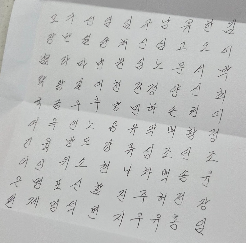 사진 속 편지엔 모·기·선·염·엄·구·남·유·한·김 등의 단어들이 가로 10개, 세로 10줄로 총 100개가 적혀 있었다.