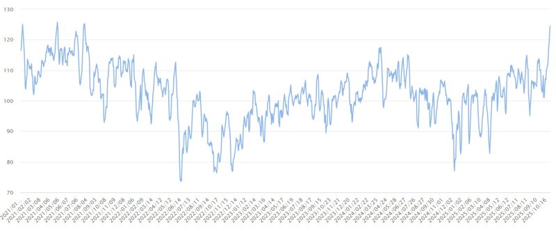 지수는 지난달 13일 101.04로 하락하기도 했다. 당시 달러·원 환율 급등으로 외환당국이 1년 6개월 만에 구두개입에 나선 시점이었다. 하지만 지수는 이후 빠르게 반등해 지난달 29일 120선을 돌파했다. 지수가 120선을 넘어선 것은 2021년 8월 2일(120.69) 이후 처음이다.