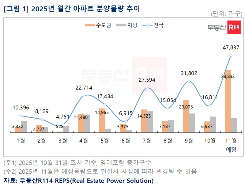 4일 부동산R114에 따르면 11월 전국에 4만7837가구의 공급이 예정됐다. 이는 올해 월간 기준 최대 물량이며, 지난해 11월 3만2000여가구와 비교해도 많은 수준이다. 특히 2021년 12월 5만9447가구 공급 이후 최근 4년여 사이 월간 기준 최대 물량이다.