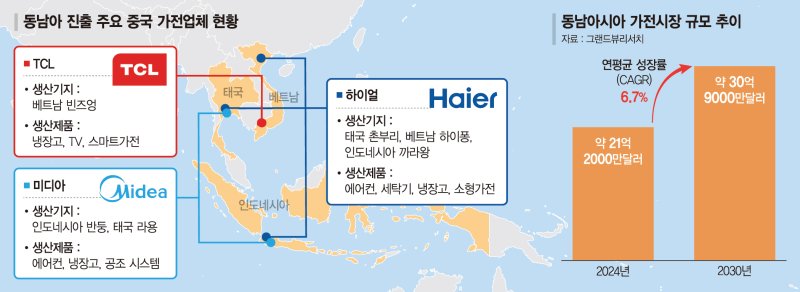 국내 가전 업계 관계자는 동남아시아 주요 국가 시장 조사를 다녀온 후 최근 중국 가전의 '굴기(일어섬)'에 대해 두려움을 담아 이같이 말했다. 중국 가전업체들은 글로벌 경기 침체로 가전 업계 주요 시장인 북미·유럽 시장이 침체되고 있는데다, 최근 트럼프 발 관세 폭탄으로 타격을 입자 동남아 시장을 주요 타깃으로 삼아 본격 공략하고 나서고 있다. 동남아 시장은 중국에게 있어 미래 시장이자 '관세 피난처'로 최근 막대한 투자를 이어나가며 한·일 기업이 양분해 온 동남아 가전 업계의 판도를 뒤흔들고 있다.