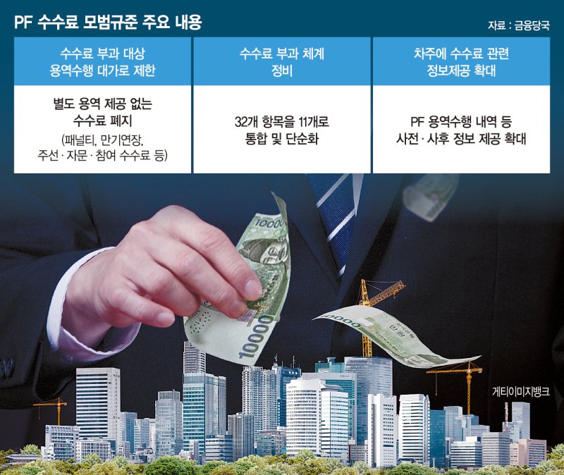 한편 금융당국은 이같은 수수료가 문제가 되자 올 1월부터 새로운 'PF 수수료 모범규준'을 만들어 시행 중이다. 32개에 달하는 수수료를 11개로 줄이고, 부과대상을 용역 수행대가로 제한한 것이 골자다. 하지만 현장의 어려움을 여전하다. 개발업계 한 관계자는 "과거 사업장은 구제 받는 것조차 쉽지 않다 보니 어디 하소연할 곳도 없다"며 "새로운 모범규준 시행 이후에도 불공정 수수료가 잘 드러나지 않을 뿐 대주단의 우월적 지위를 활용한 과도한 수수료는 사라지지 않고 있다는 것이 현장의 목소리"라고 말했다.