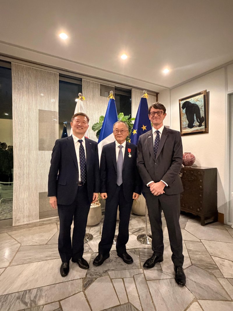 최근 프랑스 정부로부터 레지옹 도뇌르 훈장을 받은 이상률 전 항공우주연구원 원장(가운데)과 이상철 항우연 원장(왼쪽), 필립 베르투 주한프랑스대사가 기념촬영을 하고 있다. 한국항공우주연구원 제공