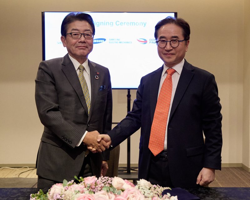 삼성전기는 지난 4일 일본 도쿄에서 장덕현 사장과 이와타 케이이치 일본 스미토모화학 회장이 차세대 패키지 기판의 핵심 소재인 글라스 코어 제조를 위한 합작법인(조인트벤처)설립 검토를 위한 양해각서(MOU)를 체결했다고 5일 밝혔다.