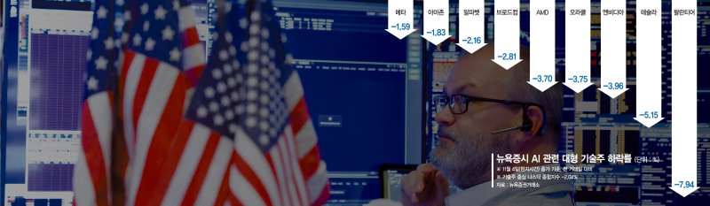 AI 대표주 팔란티어는 7.94% 폭락한 190.74달러로 마감했다. 전날 발표한 호실적에도 "밸류에이션 부담이 실적을 압도했다"는 평가가 나왔다. 엔비디아 역시 3.96% 급락, 시가총액이 하루 만에 5조달러에서 4조8380억달러로 줄었다. 전일 사상 처음 5조달러를 돌파했지만 하루 만에 무너진 것이다.