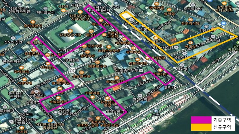 확대된 인정구역은 중앙시장 제2공영주차장~월화꽈배기~남대천식육점 구간으로, 총 3835㎡ 면적에 48개 점포가 새롭게 포함됐다.
