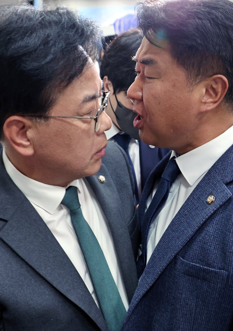 여야 고성이 커지면서 회의 진행이 어려워지자 민주당 원내대표인 김병기 운영위원장은 정회를 선언했다. 이후 의원들이 국감장을 퇴장할 때 국민의힘 송언석 원내대표와 민주당 이기헌 의원 간 배치기를 하는 몸싸움이 발생했고, 이를 말리는 과정 속에서 큰 혼란이 벌어졌다. 여야 설전에 국감이 정회된 뒤 물리적 충돌까지 빚은 것이다. 두 의원은 회의장 밖에서도 한동안 얼굴을 맞대며 노려보는 등 대치하는 모습을 연출하기도 했다.
