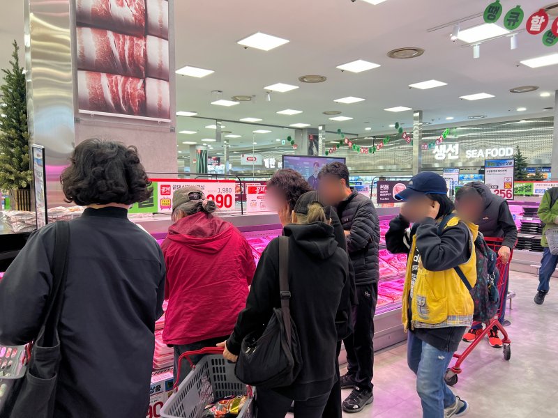 오픈과 동시에 축산코너에 가장 먼저 도착한 주부 심양은씨(75)는 카트에 돼지고기를 부위별로 여러 팩 담았다.
