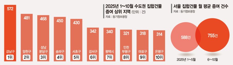 6일 법원 등기정보광장 자료를 분석한 결과 올 1~10월 집값이 급등한 강남3구와 양천구, 성남 분당구 등에서 증여가 집중된 것으로 나타났다. 우선 아파트 등 서울 집합건물 증여건수는 새 정부 출범 이후 6월부터 증가세가 눈에 띄게 나타나고 있다. 6월부터 10월까지 월평균 755건의 증여가 이뤄졌다. 이전 1~5월에는 월평균 588건의 부의 대물림이 발생했다.