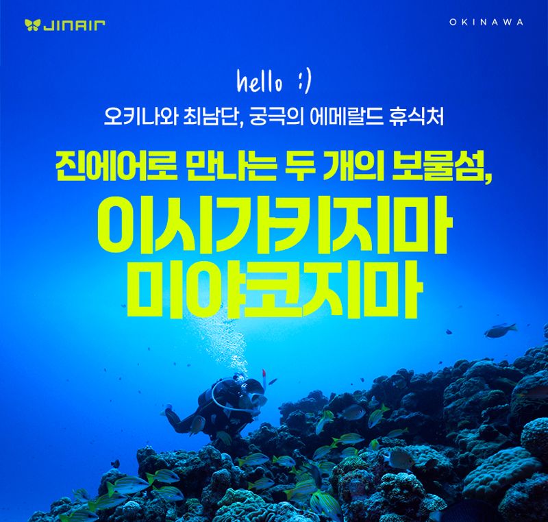 한편, 진에어는 오키나와 본섬과 미야코지마, 이시가키지마에 모두 취항하며 일본 최남단 섬 3곳에서 정기 노선을 운영하는 유일한 국적 항공사다. 이를 통해 고객들에게 새로운 여행 경험과 이동 편의를 제공하고 있다. 이시가키지마 노선의 경우 인천공항에서 매주 월·화·목·금·일 오전 9시 50분에, 미야코지마의 경우 매주 월·수·금·토·일 오전 8시에 출발한다.