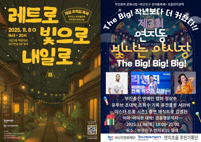 같은 날 오후 6시부터 오후 9시까지는 연지시장에서 ‘부산진구 온마을축제-연지동 빛나는 야시장 시즌3’를 개최한다.