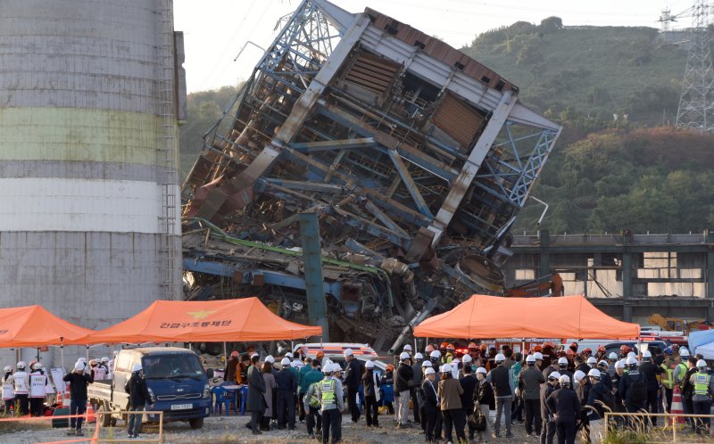 지난 6일 오후 한국동서발전 울산화력발전소에서 보일러 타워가 무너져 작업자 7명이 매몰됐다. 뉴시스