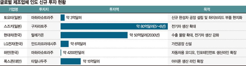 전자업계도 인도 투자를 확대하고 있다. LG전자는 인도 안드라프라데시주 스리시티에 약 6억달러(약 8747억원) 규모의 제3가전공장을 지난 5월 착공했다. 냉장고, 세탁기, 에어컨 등 연간 수백만대 생산능력을 확보하며 인도를 중동·남아시아 수출허브로 삼겠다는 전략이다. 삼성전자 전장 사업의 핵심 계열사인 하만도 지난달 인도 푸네 공장에 대규모 추가 투자를 단행, 인도를 첨단 자동차 전장 시장 공략의 전진기지로 점찍었다. 하만은 34억5000만루피(약 560억원)를 추가 투자해 차세대 텔레매틱스 및 커넥티비티 프로그램 개발에 투입될 예정이다.