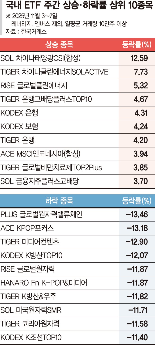 반면 조정을 받은 테마도 있다. 'PLUS 글로벌원자력밸류체인'(-13.46%), 'RISE 글로벌원자력'(-11.87%), 'SOL 미국원자력SMR'(-11.71%), 'TIGER 코리아원자력'(-11.58%) 등 원자력 관련 ETF의 하락세가 두드러졌다. 또한 'ACE KPOP포커스'(-13.18%), 'TIGER 미디어컨텐츠'(-12.90%), 'HANARO Fn K-POP&미디어'(-11.87%) 등 K-팝 열풍에 승승장구하던 ETF의 하락이 나타났다. 'KODEX K방산TOP10'(-12.07%), 'TIGER K방산&우주'(-11.82%), 'TIGER K조선TOP10'(-11.40%) 등도 낙폭을 확대했다.