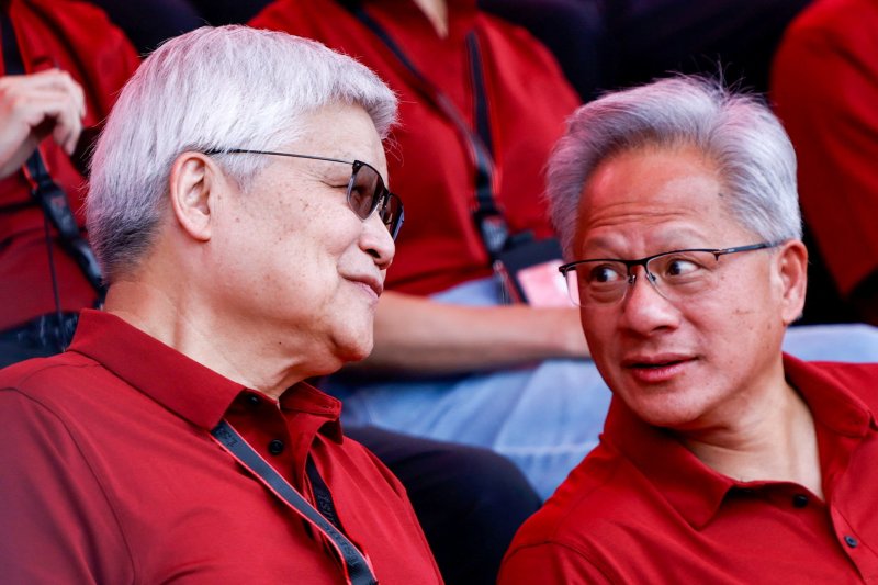 젠슨 황(오른쪽) 엔비디아 최고경영자(CEO)와 웨이저자 TSMC 회장이 8일 대만 신주 시에서 열린 TSMC 연례 체육대회에 참석해 대화하고 있다. 로이터연합뉴스