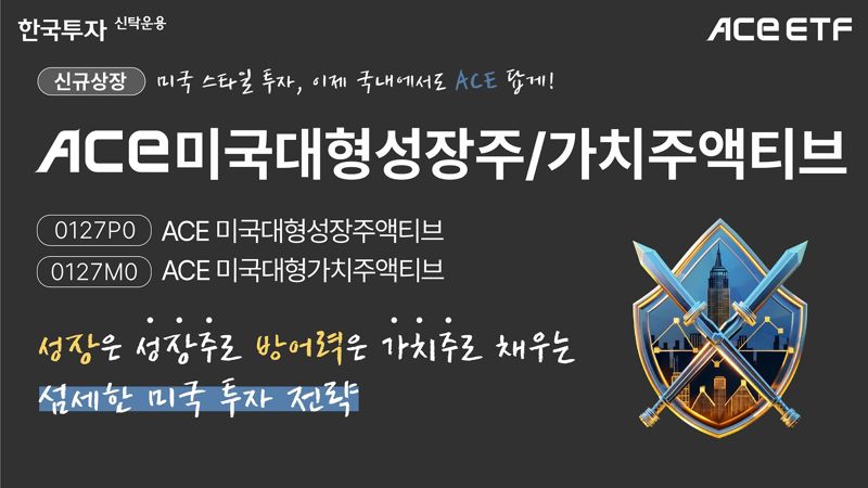 [파이낸셜뉴스] 한국투자신탁운용은 오는 11일 액티브 상장지수펀드(ETF) 2종을 신규 상장한다고 10일 밝혔다. 2종 상품은 'ACE 미국대형성장주액티브 ETF'와 'ACE 미국대형가치주액티브 ETF'다.