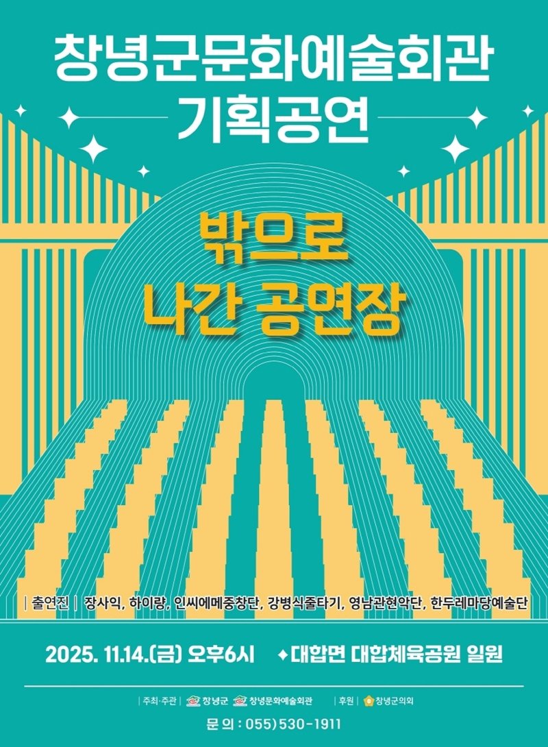 [창녕=뉴시스] 안지율 기자 = 경남 창녕군은 오는 14일 오후 6시부터 7시30분까지 대합면 체육공원에서 특별 기획 공연 '밖으로 나간 공연장'을 개최한다고 10일 밝혔다.
