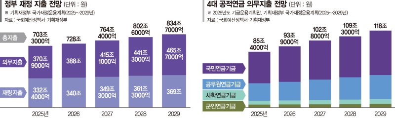 예정처가 최근 분석한 복지분야 국가재정운용계획(2025~2029년)을 보면 기재부가 확정한 재정 추산보다 상황이 심각하다. 예정처 분석으로는 공적연금의 의무지출 증가 속도가 더 빠르다. 기재부는 공적연금 의무지출을 2022년 이후 올해까지 4년간 11조원 정도를 초과해 지출했다. 2022년 4조4000억원, 2023년 3조8000억원, 올해 1조6000억원 등이다.