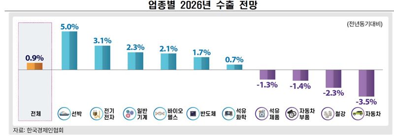 한국경제인협회는 10대 수출 주력 업종·매출액 1000대 기업 대상(150개사 응답) '2026년 수출 전망 조사'(모노리서치 수행)를 진행한 결과, 2026년 수출이 올해 대비 0.9% 증가할 전망이라고 11일 밝혔다. 조사 대상 업종은 반도체, 일반기계, 자동차, 석유화학, 철강, 석유제품, 선박, 자동차부품, 바이오헬스, 전기전자(컴퓨터·디스플레이·이동통신기기)다. 기업들이 채산성을 확보할 수 있는 내년도 적정 환율로는 평균 '달러당 1375원'으로 조사됐으나, 기업들의 내년도 환율 전망치는 평균 1456원으로 집계됐다.