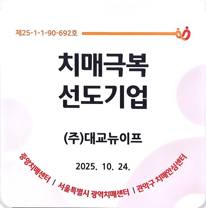 이번 지정은 대교뉴이프의 데이케어센터와 방문요양센터가 ‘치매극복선도단체’로 선정된 데 이어, 본사까지 선도기업으로 추가 지정된 것이다. 치매 인식 개선과 예방·돌봄 서비스를 통합적으로 추진해 온 공로를 인정받았다.