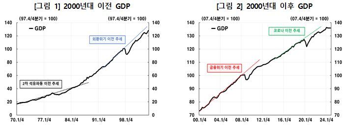 실제 1997년 외환위기, 2008년 글로벌 금융위기, 2020년 코로나19 팬데믹을 거칠 때마다 경제성장률은 단계적으로 하락했다. 실제 각 국면별로 따져보면 1990~1997년 대비 2000~2007년 성장률 하락폭은 연 평균 2.8%p였다.