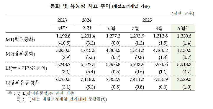 한국은행이 12일 발표한 '통화 및 유동성' 통계에 따르면, 9월 평균 광의 통화량(M2 기준·평잔)은 4430조5000억원으로 전월보다 0.7%(30조3000억원) 늘었다. 다만 상승폭은 지난 8월(1.3%)과 비교해 증가율은 낮았다.