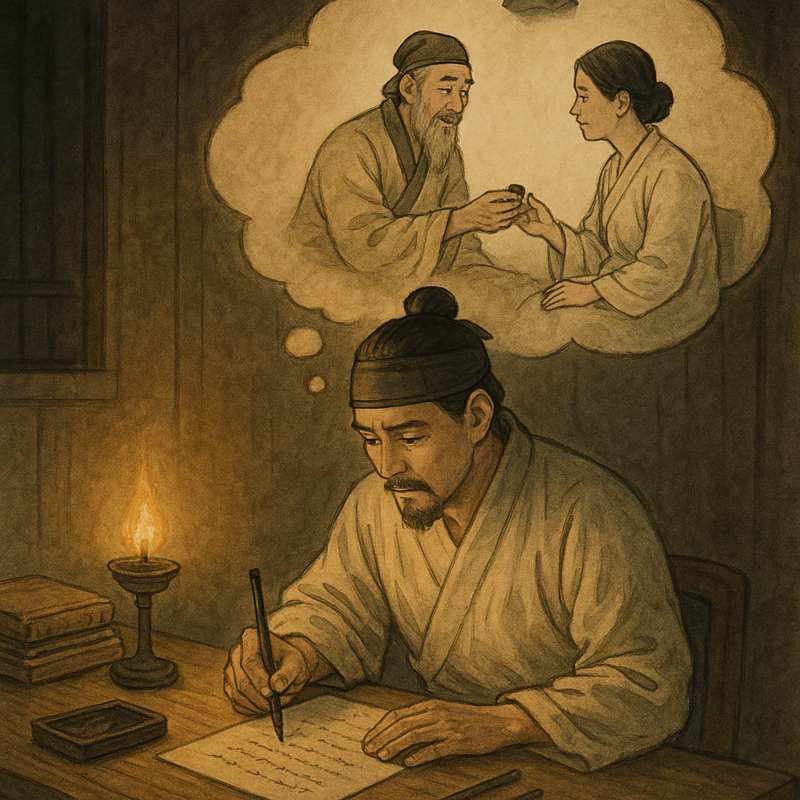 옛날에 심대방(沈大方)이라는 사람이 있었다. 그는 세속의 무리와 어울리지 않고 산 중에 은거하며 살았다. 그는 방 안에서 글만 읽었다. 그러니 생계는 어려울 수밖에 없었고, 그의 아내는 산 중의 밭일을 하면서 과로를 일삼았다.