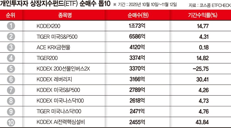 12일 코스콤 ETFCHECK에 따르면 최근 1개월(10월 10일~11월 12일) 동안 개인 순매수 1위는 'KODEX 200(1조73억원)', 2위는 'TIGER 200(3374억원)'으로 코스피를 추종하는 상품이 상위를 차지했다. 코스피 2배 레버리지 ETF인 'KODEX 레버리지(3166억원)'도 순매수 6위를 차지했다. 코스피 지수에 베팅한 규모만 톱10 순매수액의 약 40%에 달했다.