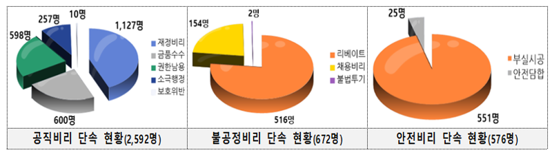 구체적으로 공직비리 분야에서는 △재정비리 1127명(송치 193명) △금품수수 600명(송치 205명) △권한남용 598명(송치 78명) △소극행정 257명(송치 6명) △제보자 보호 위반 10명(송치 3명) 순으로 단속 인원이 많았다.