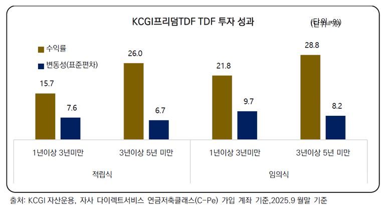 13일 KCGI운용은 다이렉트 서비스를 통해 연금저축 클래스로 TDF에 가입한 1만 983개 계좌의 올해 9월 말 기준 수익률을 보유 기간별로 집계했다고 밝혔다.