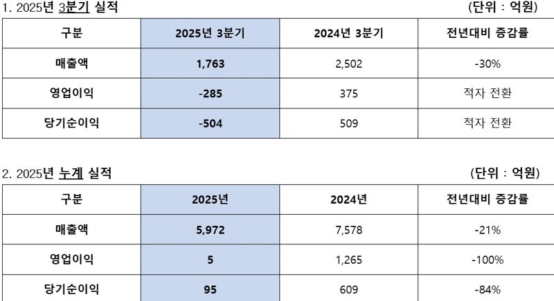 올해 3분기 누적 기준 매출액은 5972억원, 영업이익 5억원, 당기순이익 95억원이다.