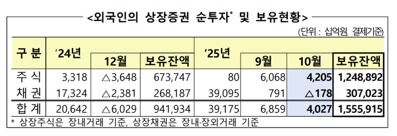 14일 금융감독원이 발표한 '2025년 10월 외국인 증권투자 동향'에 따르면 외국인은 지난달 상장주식 4조2050억원어치를 사들이면서 6개월 연속 순매수를 이어갔다. 다만 상장채권의 경우 1780억원어치를 순회수하면서 한 달 만에 순회수로 전환했다.