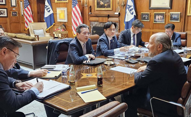 [서울=뉴시스] 홍효식 기자 = 김정관 산업통상부 장관과 김용범 대통령실 정책실장이 지난 10월 16일(현지 시간) 미국 워싱턴 D.C. 상무부 회의실에서 하워드 러트닉(Howard Lutnick) 상무부 장관과 면담을 갖고, 한미 관세협상 현안 등을 논의하고 있다. 산업통상부 제공